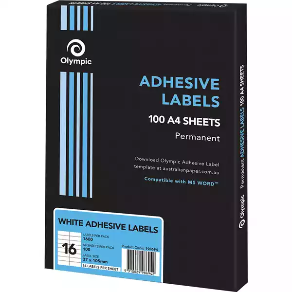 OLYMPIC ADHESIVE MULTIPURPOSE LABELS SQUARE CORNERS 16UP 105 X 37MM WHITE BOX 100